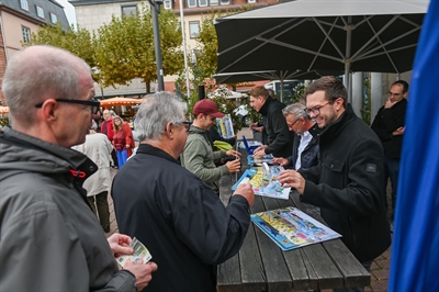 Vor dem künftigen Stadttreff, dem Projektbüro für die Entwicklung des Stadthof Hanau, direkt am Hanauer Wochenmarkt startete der Bürgermeister den Verkauf des traditionellen Hanauer Adventskalenders. „Der Kalender bringt vieles zusammen, was uns und unsere Stadt ausmacht. Gesellschaftliches Engagement, Gemeinschaftssinn und eine gedankliche Grundeinstellung, die auf Unterstützung und Nächstenliebe fußt“, so Dr. Bieri. Dass der Kalender dieses Jahr als Motiv eine Collage darstellt, die das 100-jährige Jubiläum des Hanauer Hafens mit Motiven der Brüder Grimm Festspiele vereint und der Verkauf in unmittelbarer Nähe des Stadthofs, dem ehemaligen Kaufhof, unterstützt von zwei Hanauer Lions Clubs stattfinde, bringe auf symbolische Weise auch sehr große Teile des Hanauer Stadtprofils zusammen.